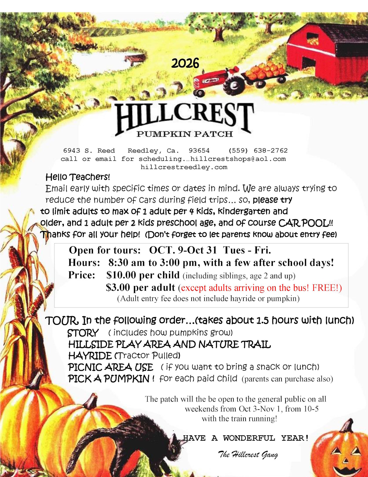 Train tickets: $5 (one way) and $10 (two way)age 2 and up (With the new twice as long train ride, one ticket will take you from upper Hillcrest Station to lower Wahtoke Station and visa versa. You can buy tickets at both levels.. no more carrying pumpkins up the hill to the parking lot! You will disembark the train at both stations.
